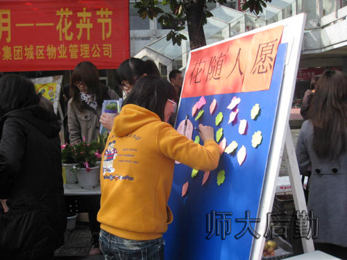 活动一开始,前来询问与购买的师生络绎不绝。仙人球、芦荟、蟹爪兰、碧玉、小榕树等小盆景受到了师生的欢迎,不少师生还向主办方提出盆栽订购的要求。活动现场,主办方还组织绿化工为师生讲解花卉养护的小常识小技巧,并分发绿色植物基本养护知识的资料。记者注意到,较之往年的活动,今年的活动现场多了一处“许愿墙”,以便于师生贴心愿便利贴。公司负责人表示,这个小创意是想让师生在购买盆栽时许下心愿,为校园增添暖暖的爱意。