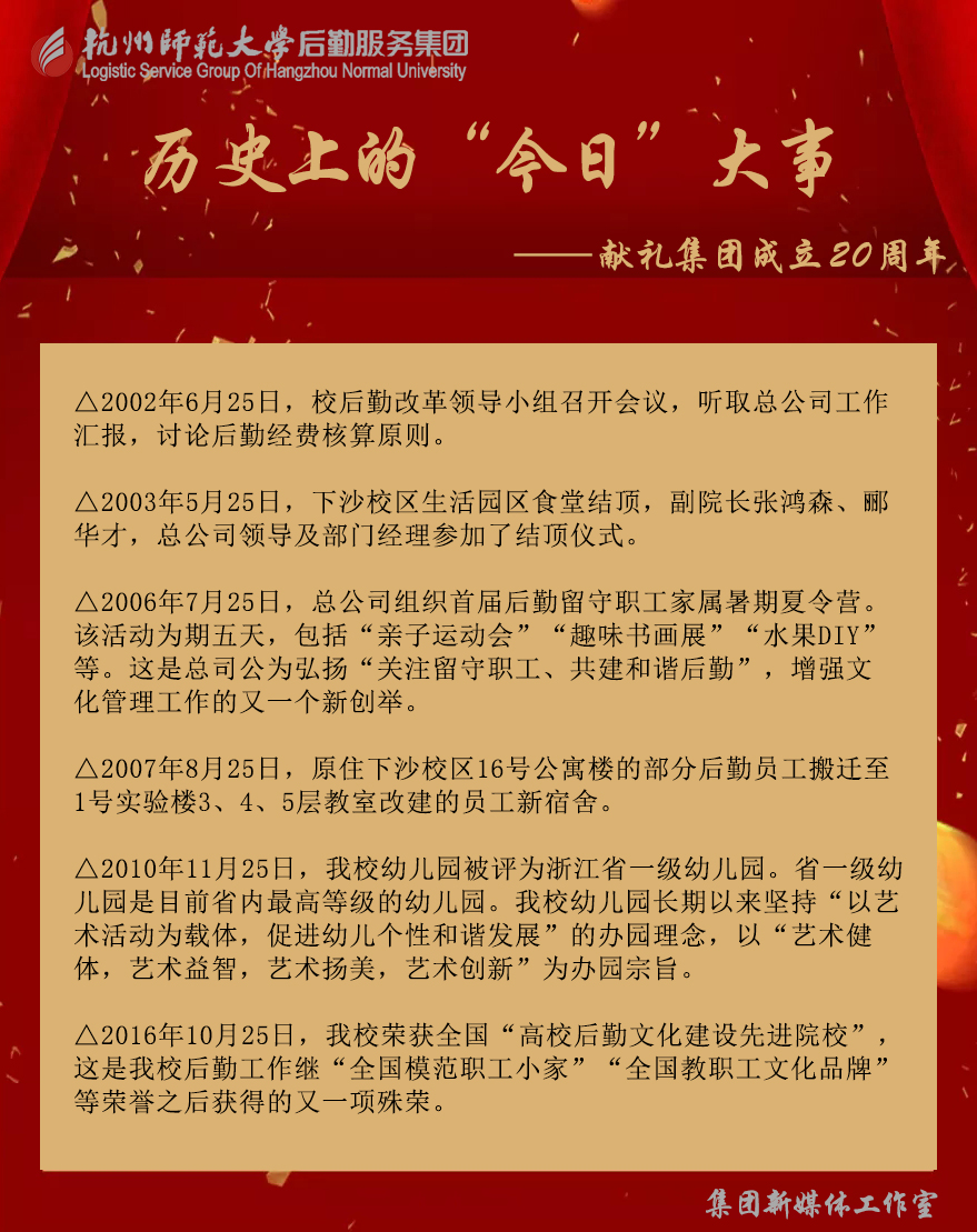 站在新的历史起点,面对新的发展机遇,我们更要好好守护这段共同经历的珍贵记忆,从中汲取前行的力量,在新的征程上砥砺前行!官网自今日起,特推出《历史上的“今日”大事》专栏,向集团20周年献礼。