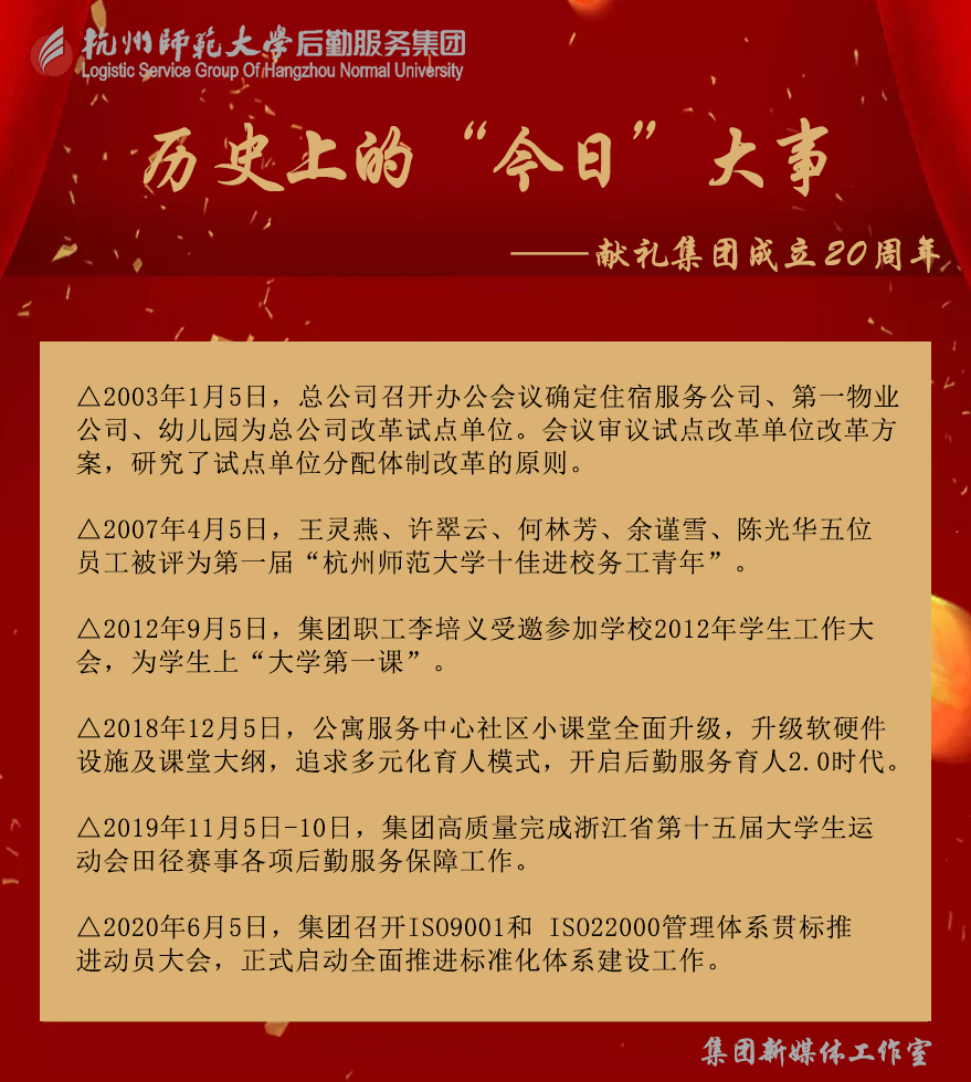 站在新的历史起点,面对新的发展机遇,我们更要好好守护这段共同经历的珍贵记忆,从中汲取前行的力量,在新的征程上砥砺前行!官网自今日起,特推出《历史上的“今日”大事》专栏,向集团20周年献礼。