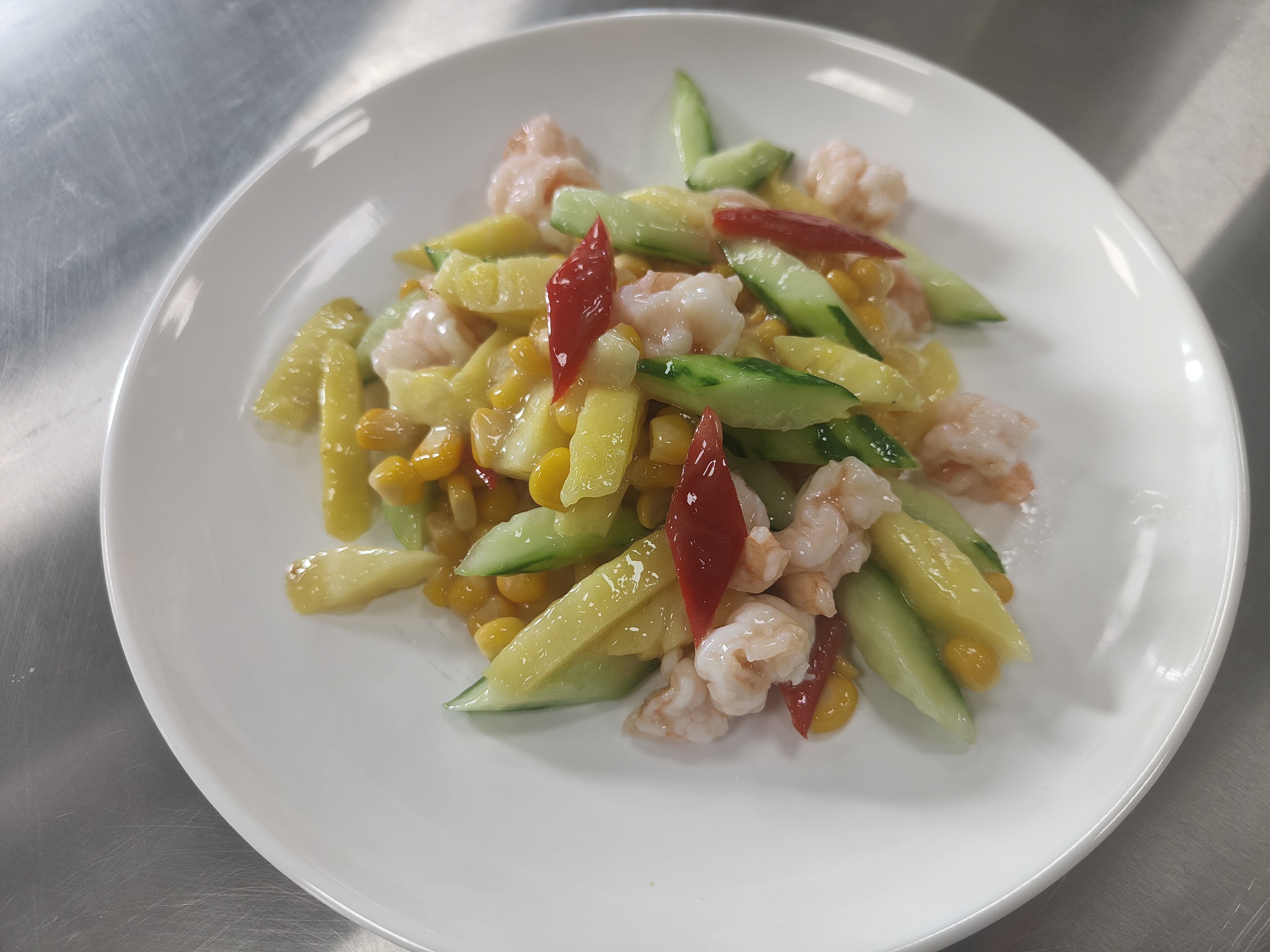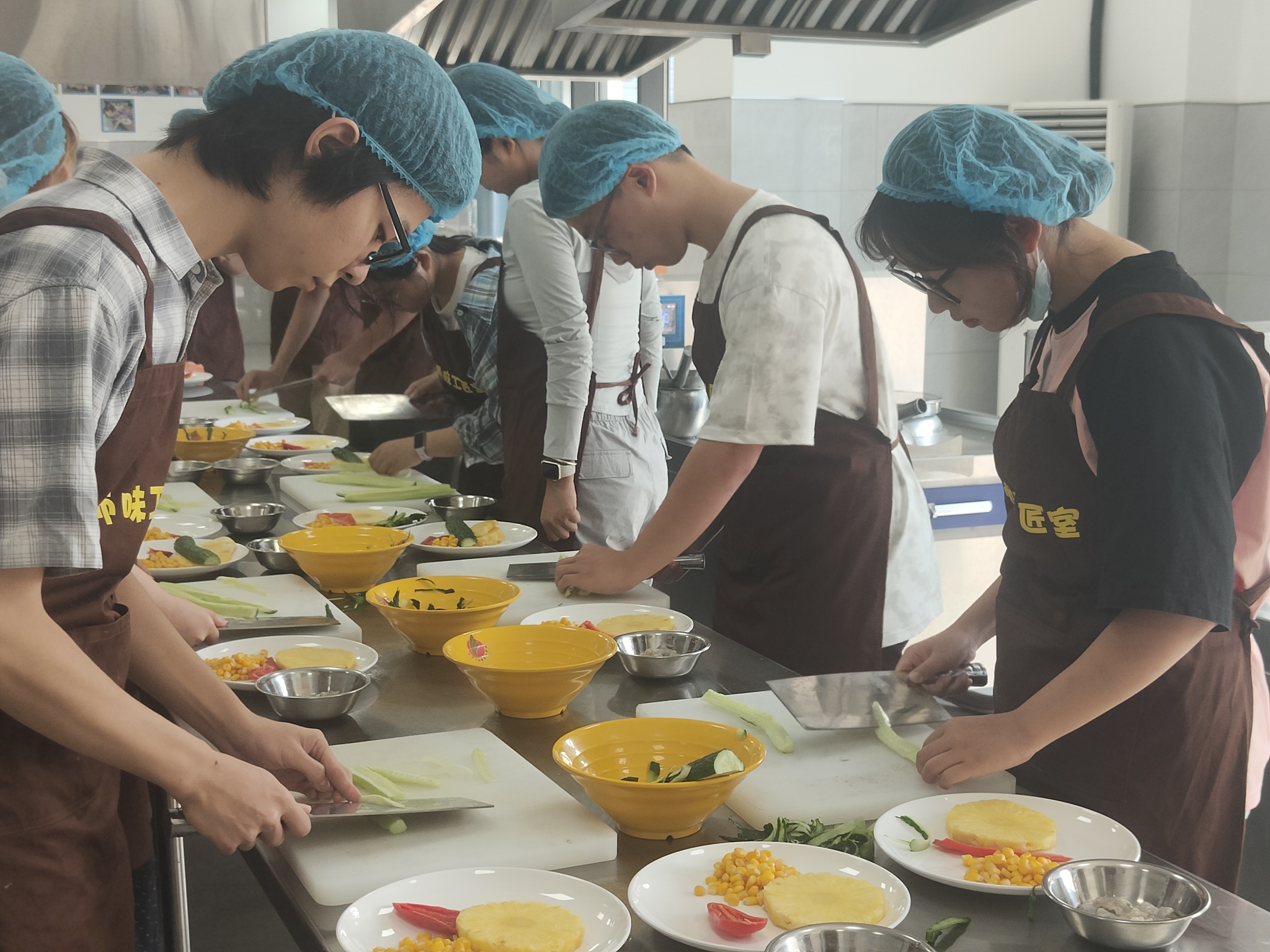 饮食服务中心开展黄瓜菠萝炒虾仁烹饪课程。10月15日,博雅苑餐厅梁坤峰师傅与工作室负责人刘元提前备好食材,详细讲解食材处理、虾仁滑油及菠萝快炒等关键技术。学员在实操中掌握烹饪要领,成品色泽明快。课程以食材为载体,将厨房转化为融合劳育、美育与食育的实践课堂。