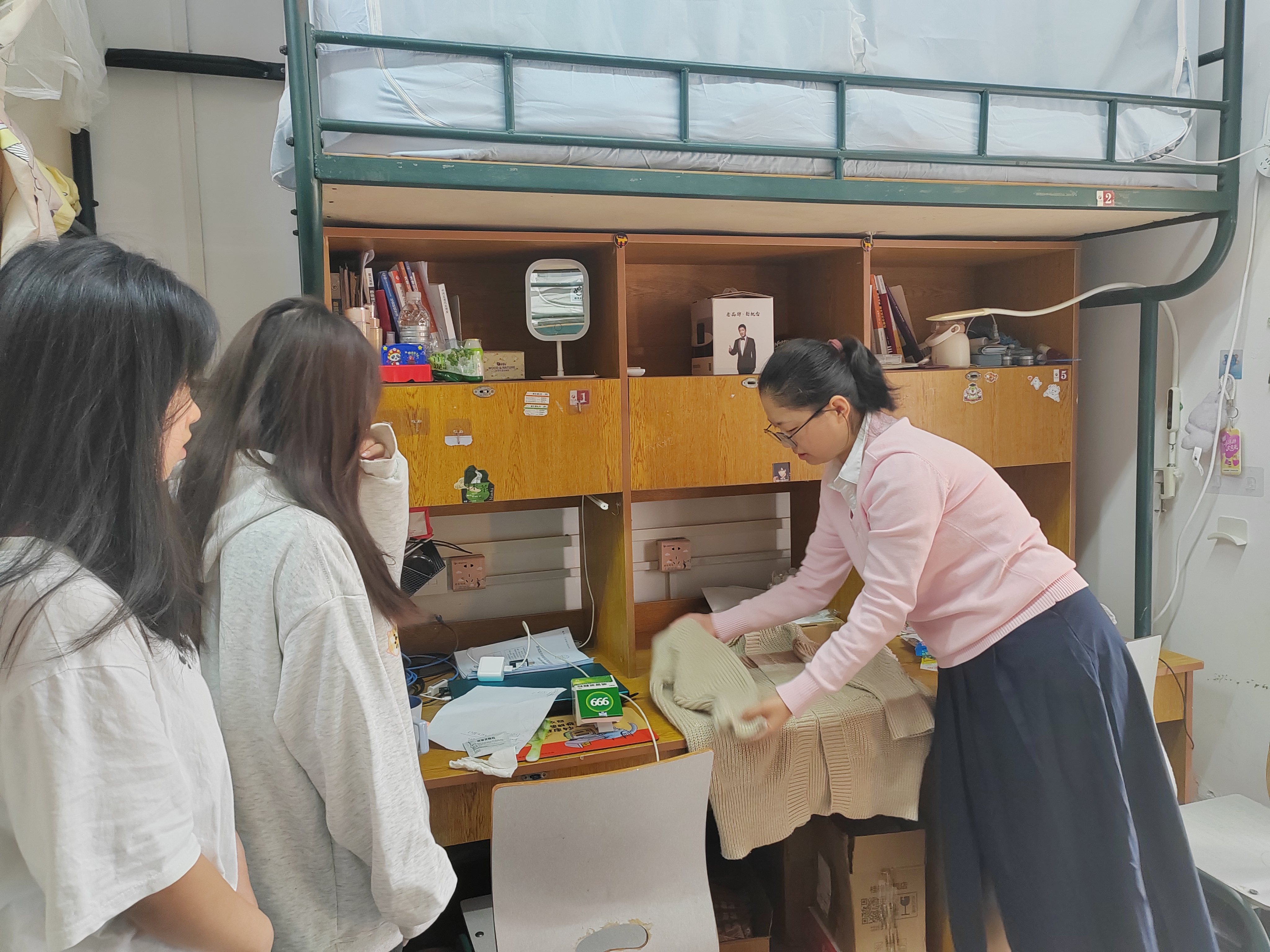 公寓服务中心开展寝室收纳技巧社区小课堂。生活老师深入学生宿舍现场教学,演示衣物快速折叠、垂直空间利用及零碎物品分类等实用收纳技巧,指导学生运用收纳盒、隔板等工具优化空间布局,并融入断舍离生活理念。此次活动帮助学生打造整洁有序的居住环境,培养高效自律的生活习惯,从整理收纳中获得心灵宁静与积极能量。