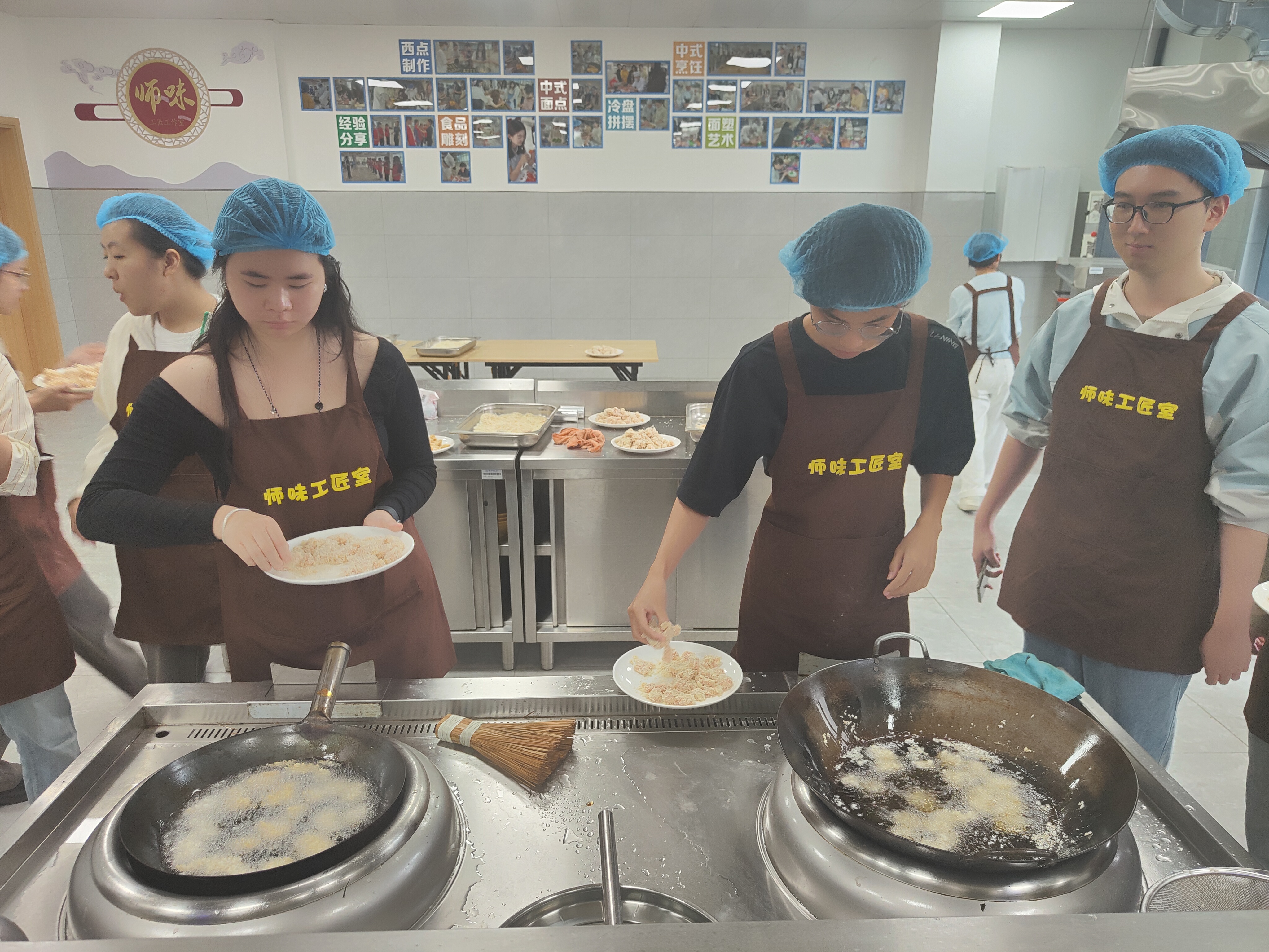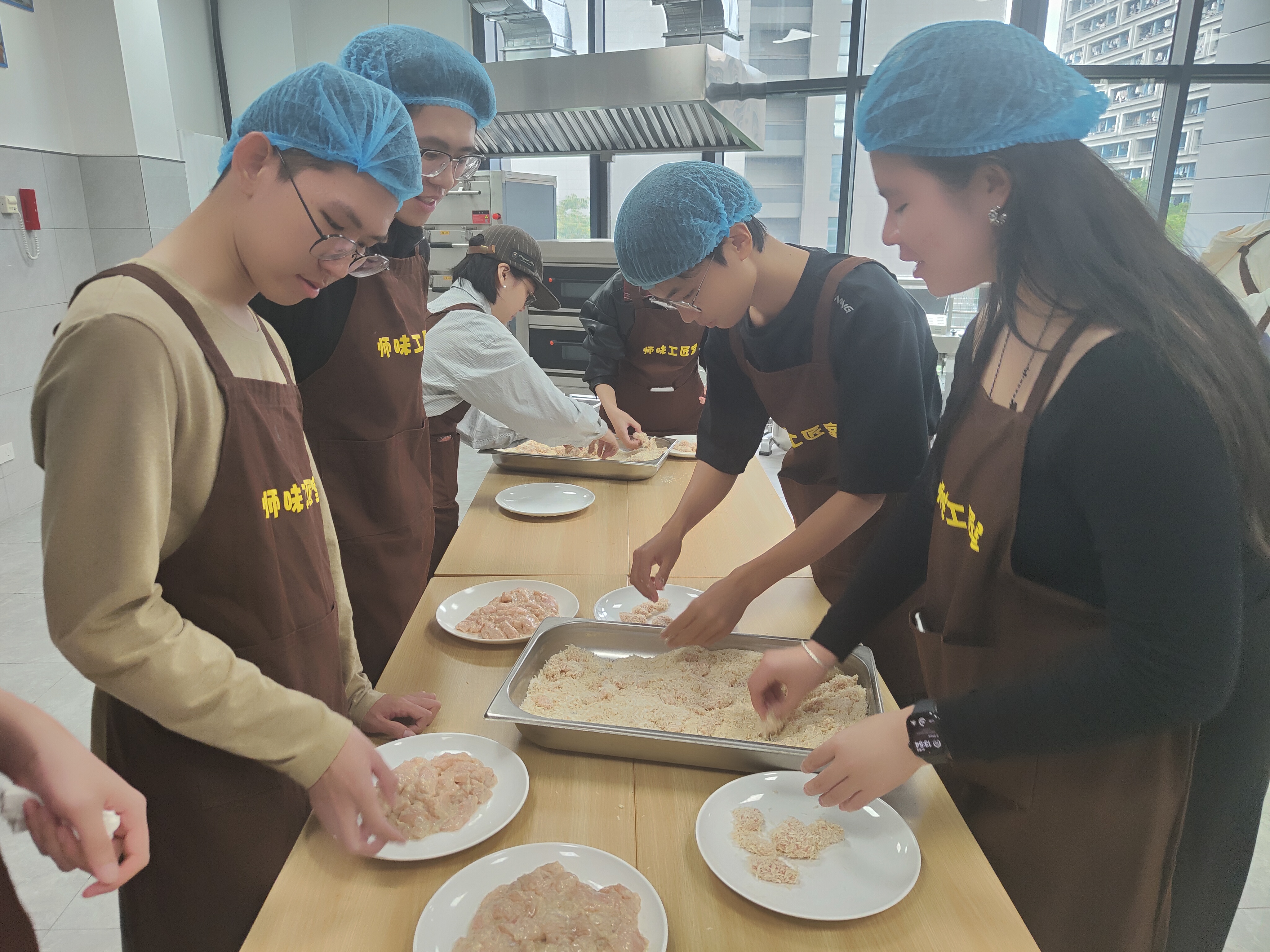 饮食服务中心工匠工作室开设手工鸡米花制作课程。指导老师系统演示从选材、切配、腌制、裹粉到油炸的全流程操作要点。学生们认真学习每个环节,在实践操作中逐步掌握鸡肉切块、调料腌制和裹粉油炸等关键技术。当金黄酥脆的鸡米花新鲜出锅时,实训室内香气四溢,学生们通过亲身体验不仅学会了美食制作技艺,更感受到劳动创造的成就感与团队协作的乐趣。