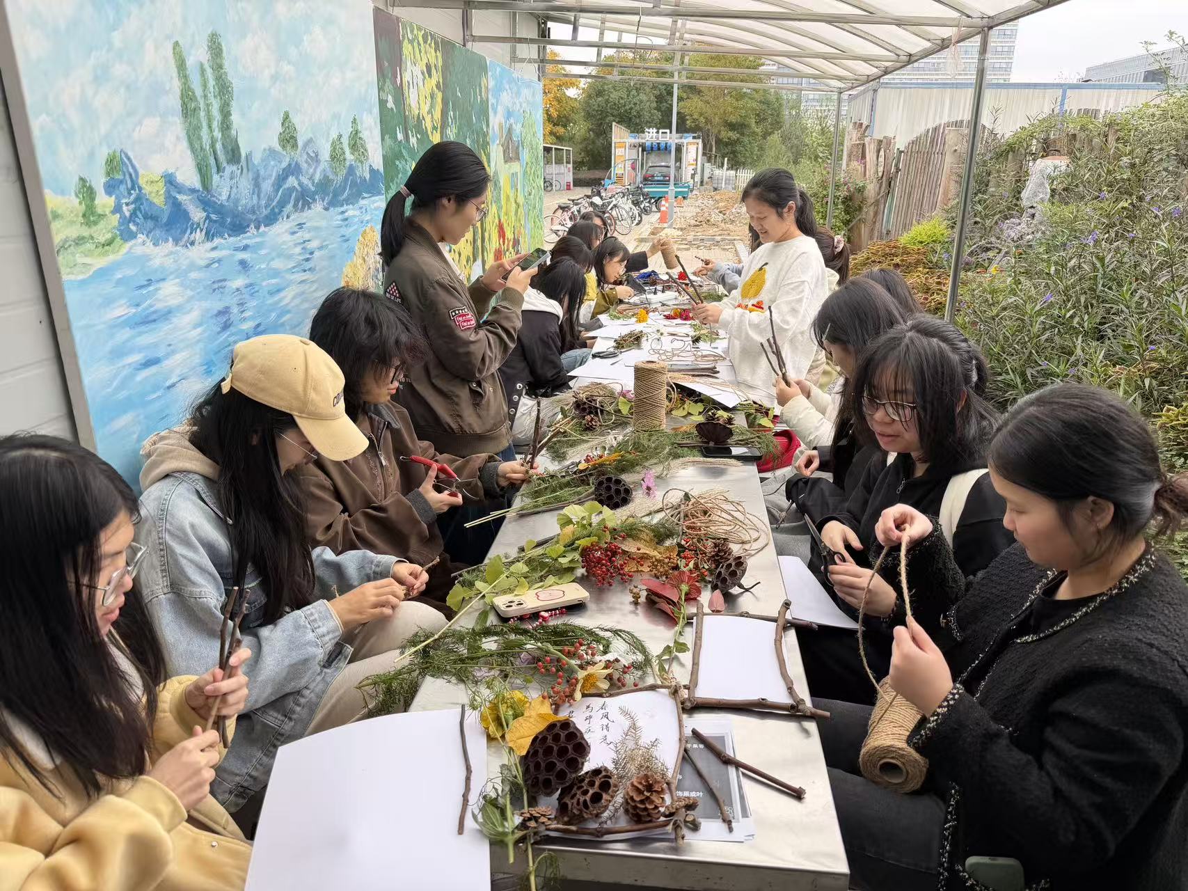 ▲仓前校区物业服务中心绿艺工匠工作室开展DIY墙壁树枝挂画制作活动。该活动吸引众多同学参与,大家利用校园内收集的枯枝、落叶、松果、干花等天然材料,经设计构图、拼接粘贴,将废弃物品转化为独具美感的壁挂艺术品。现场创作氛围浓厚,成品既保留自然质朴韵味,又传递了变废为宝的环保理念。
