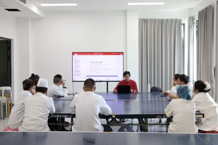 ▲城区服务中心在玉皇山校区开展食品卫生安全专项培训。为强化餐饮从业人员安全意识、筑牢校园食品安全屏障,部门邀请浙江商业职业技术学院张大中老师授课,培训聚焦责任意识、操作规范、风险防控三大维度,以专业知识助力员工技能提升。