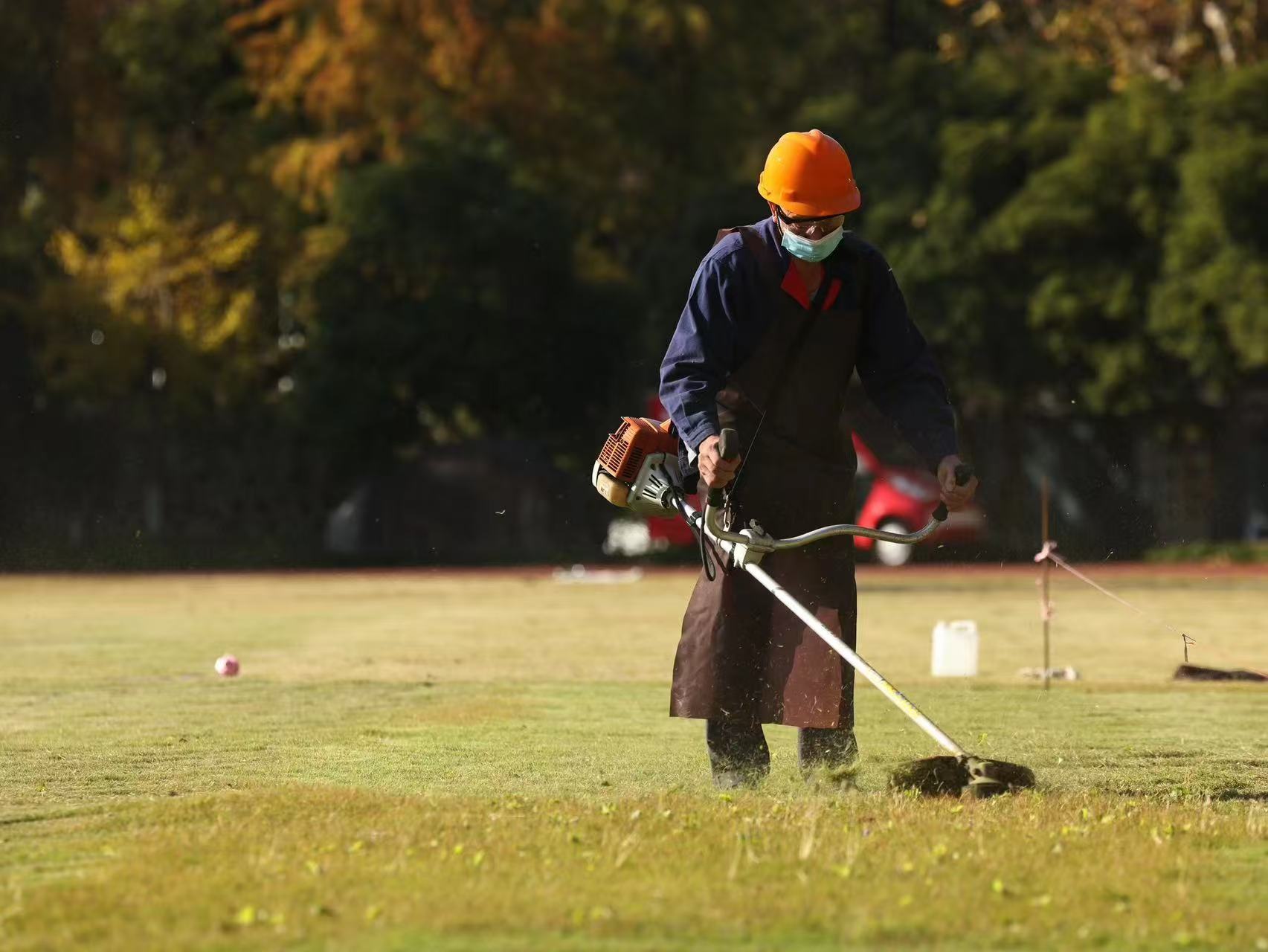 绿化养护现场:参赛人员手持专业工具,对花木草坪进行精心修剪与塑形,将“三分种、七分养”的精细化管理理念转化为一道道靓丽的校园风景线。