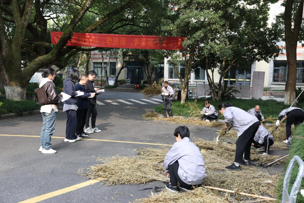 清卫技能展示:在传统的扫把捆扎项目中,清卫员们手法娴熟、工序严谨,将寻常竹丝编织成结实耐用的工具,展现了朴实专注的工匠精神。