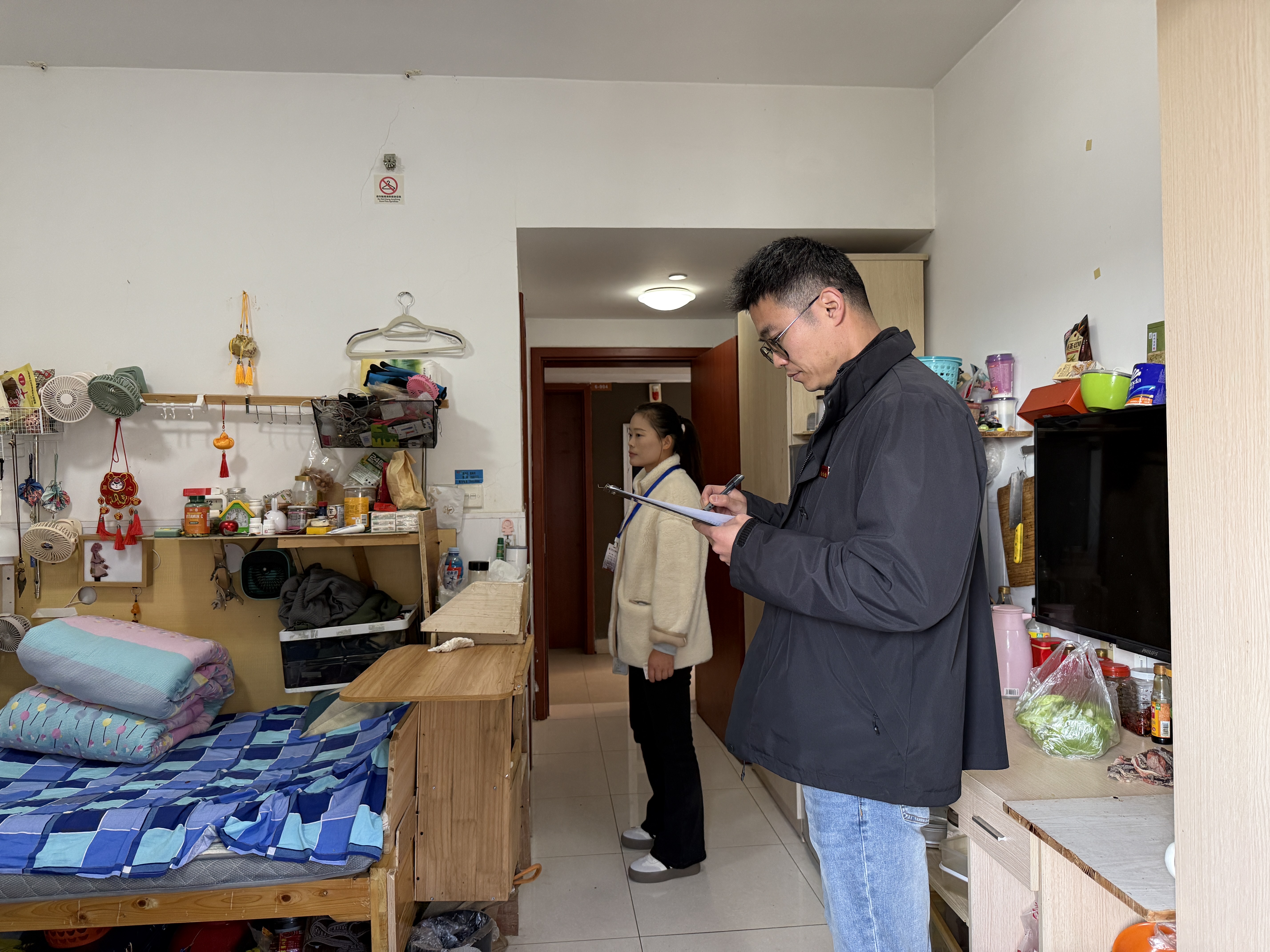 ▲仓前校区物业服务中心开展员工宿舍安全专项检查。12月9日,部门组织开展专项检查行动,聚焦消防安全、用电安全及环境卫生三大重点,对宿舍区消防设施、电器设备运行状态、疏散通道畅通情况等进行逐一排查,确保各类安全设施完好有效、疏散路径无阻碍。针对检查中发现的环境卫生问题,工作人员现场提出整改意见,明确整改要求与时限,切实筑牢员工宿舍安全防线。