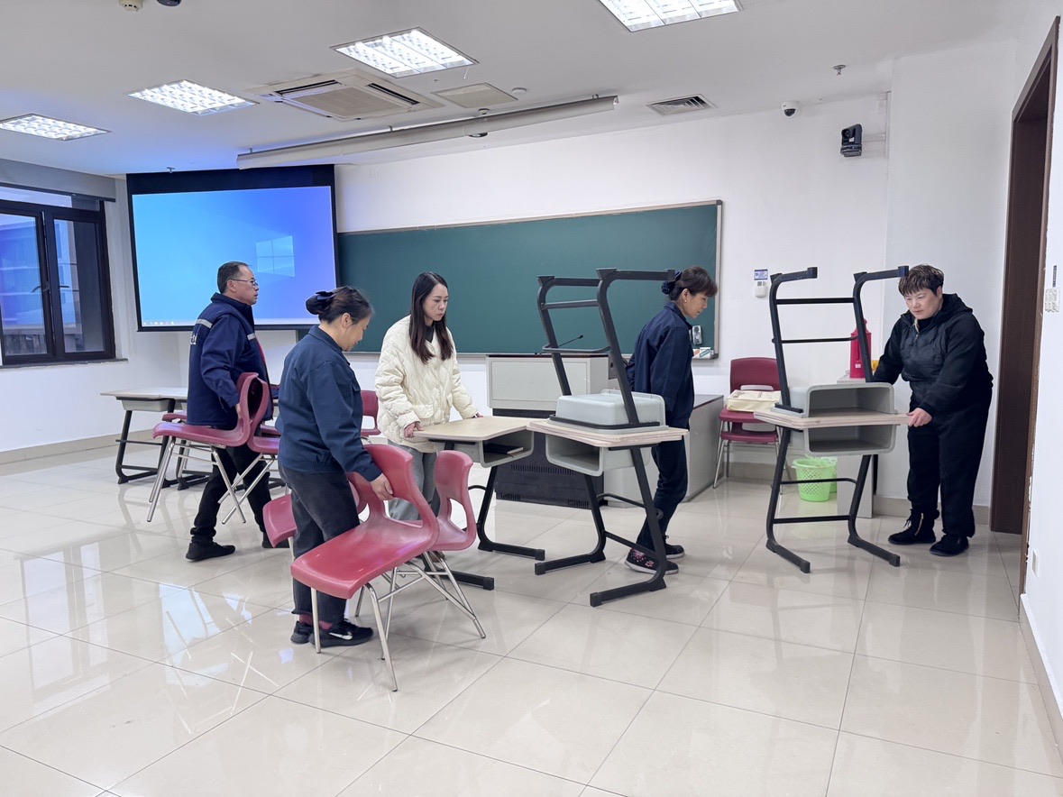 ▲仓前校区物业服务中心扎实做好教师资格证面试服务保障工作。12月6日至7日,2025年度教师资格证面试在恕园11至14号楼开展,考前部门严格对标考试要求,高效完成43个教室的标准化布置,细致落实桌椅摆放、标识张贴等关键细节。考试期间,工作人员全员坚守岗位,提供实时保洁服务,及时清理公共区域及考场周边卫生,同时规范引导用餐后垃圾分类分拣工作,全力维护考场整洁有序环境,为考试顺利进行保驾护航。