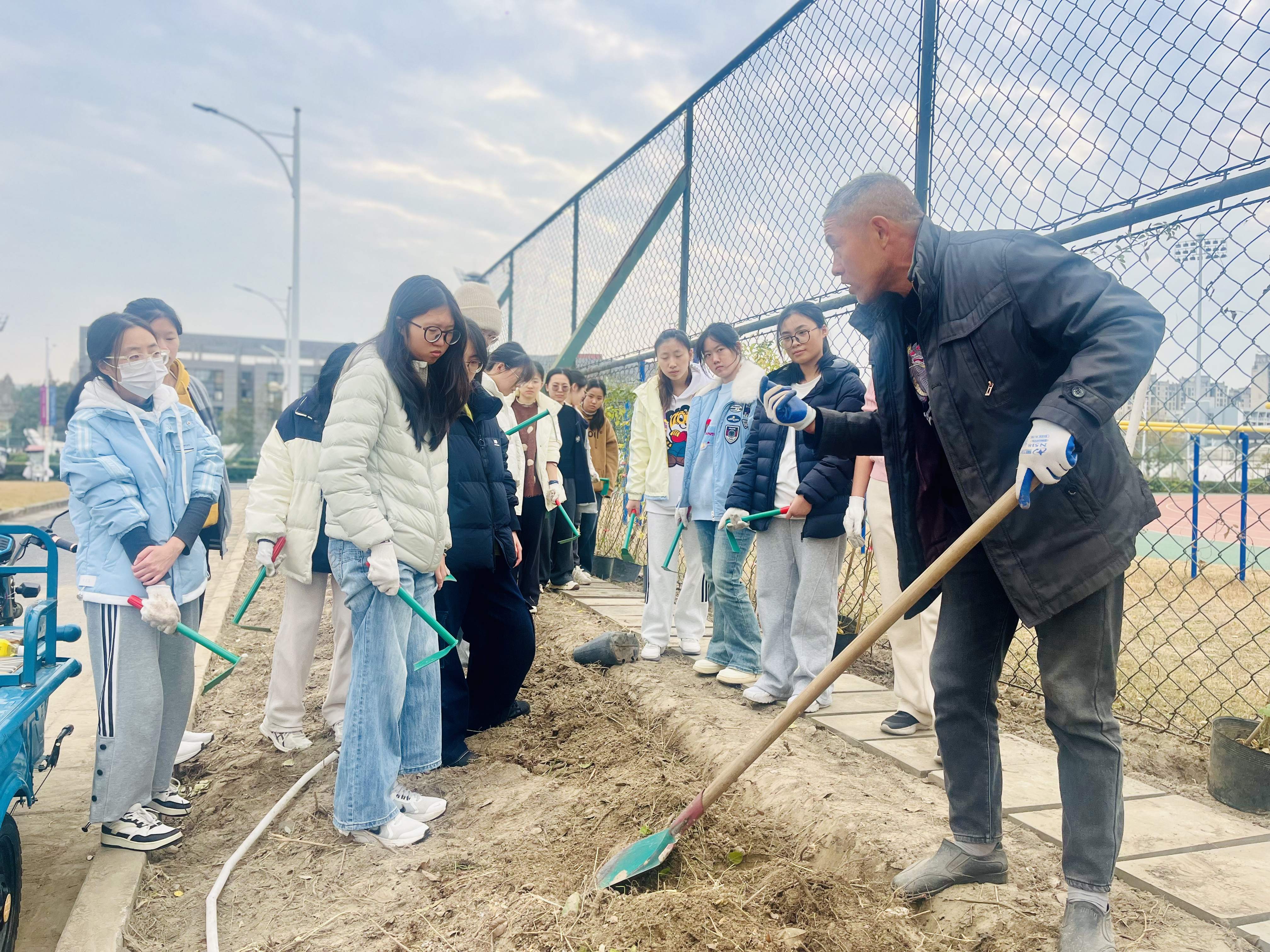 下沙校区物业服务中心开展蔷薇种植劳动教育课。部门组织20名学生前往西林广场参与实践活动,绿化师傅现场示范挖坑、栽种等种植技巧,并细致讲解蔷薇日常养护要点。学生们两两一组、分工协作,手持锄头铁锹、佩戴手套有条不紊完成种植全流程。活动将绿化知识与劳动实践深度融合,让学生在实操中体验劳动乐趣、增长技能,既美化校园环境,又强化劳动责任意识,切实践行后勤服务育人理念。