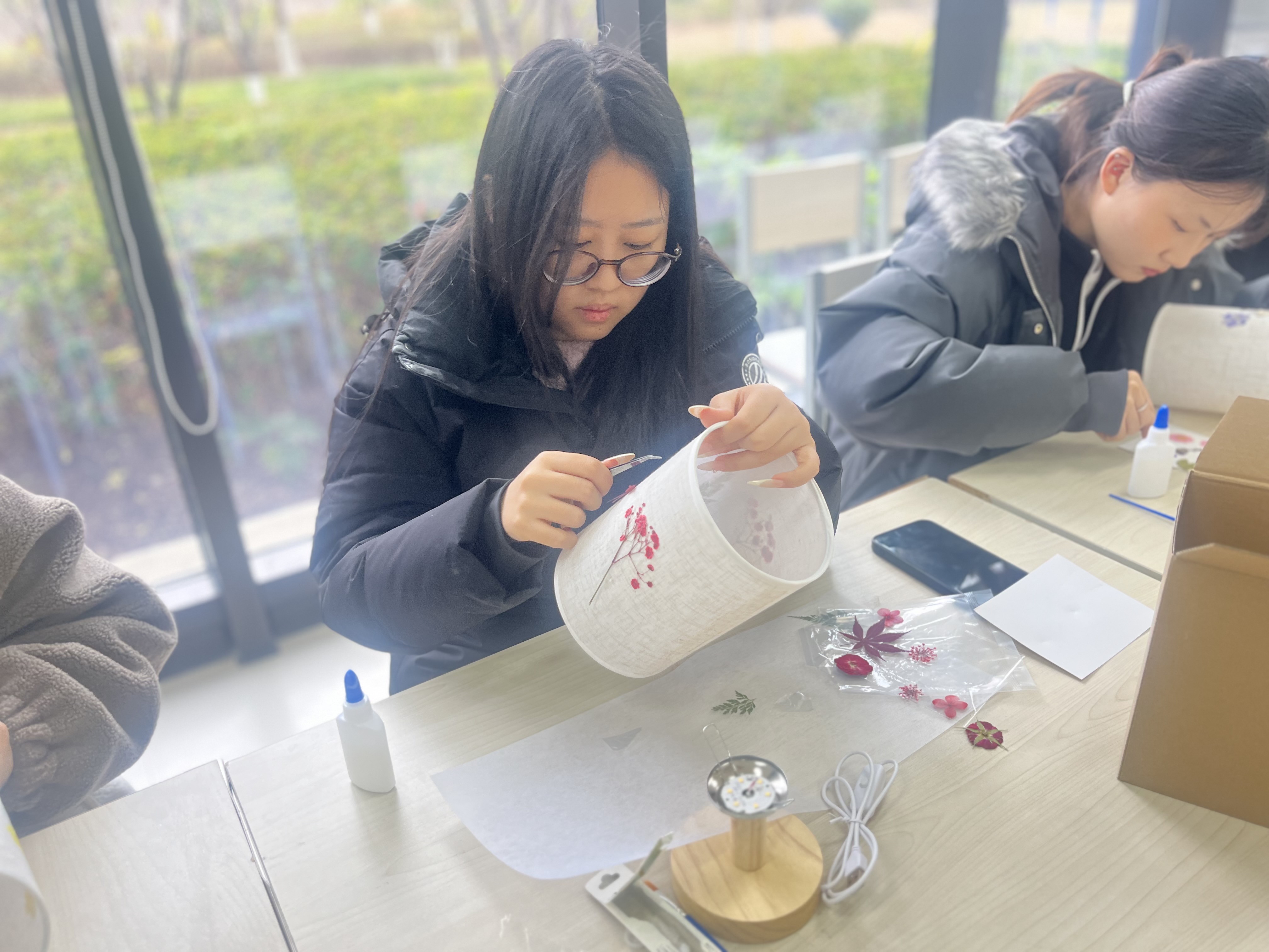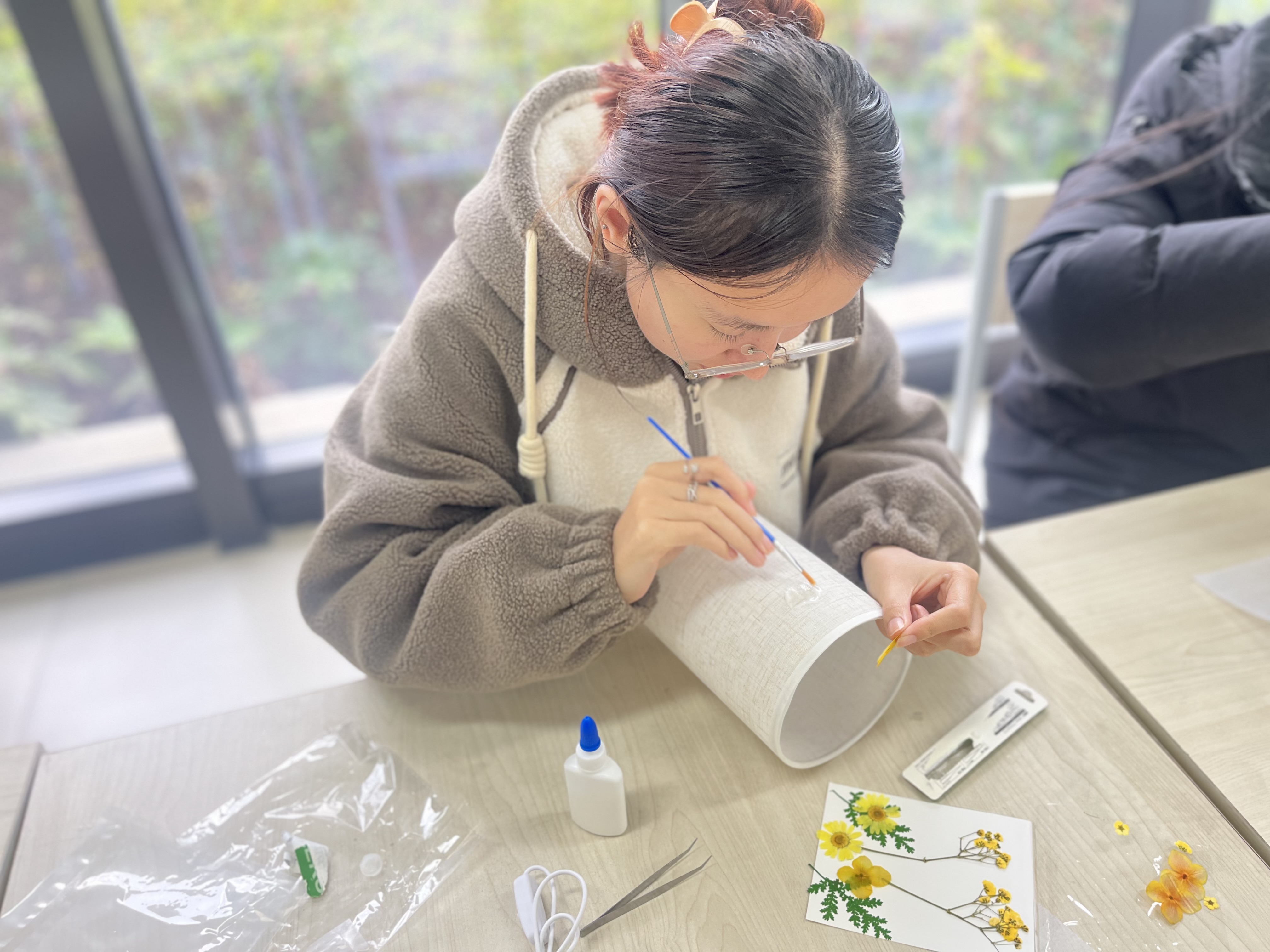 公寓服务中心开展压花台灯社区小课堂活动。课堂上,授课老师引导同学们亲手运用素材,巧思布局并将花草定格于灯罩之上。待台灯点亮,柔和光影透过花瓣纹理,绽放出独特雅致韵味。此次活动不仅锻炼同学们的动手实践能力,更让大家在劳动创作中感受手作之美,既点亮校园生活的温馨一角,也播撒美育种子、点亮心中美育之光,获参与者广泛好评。