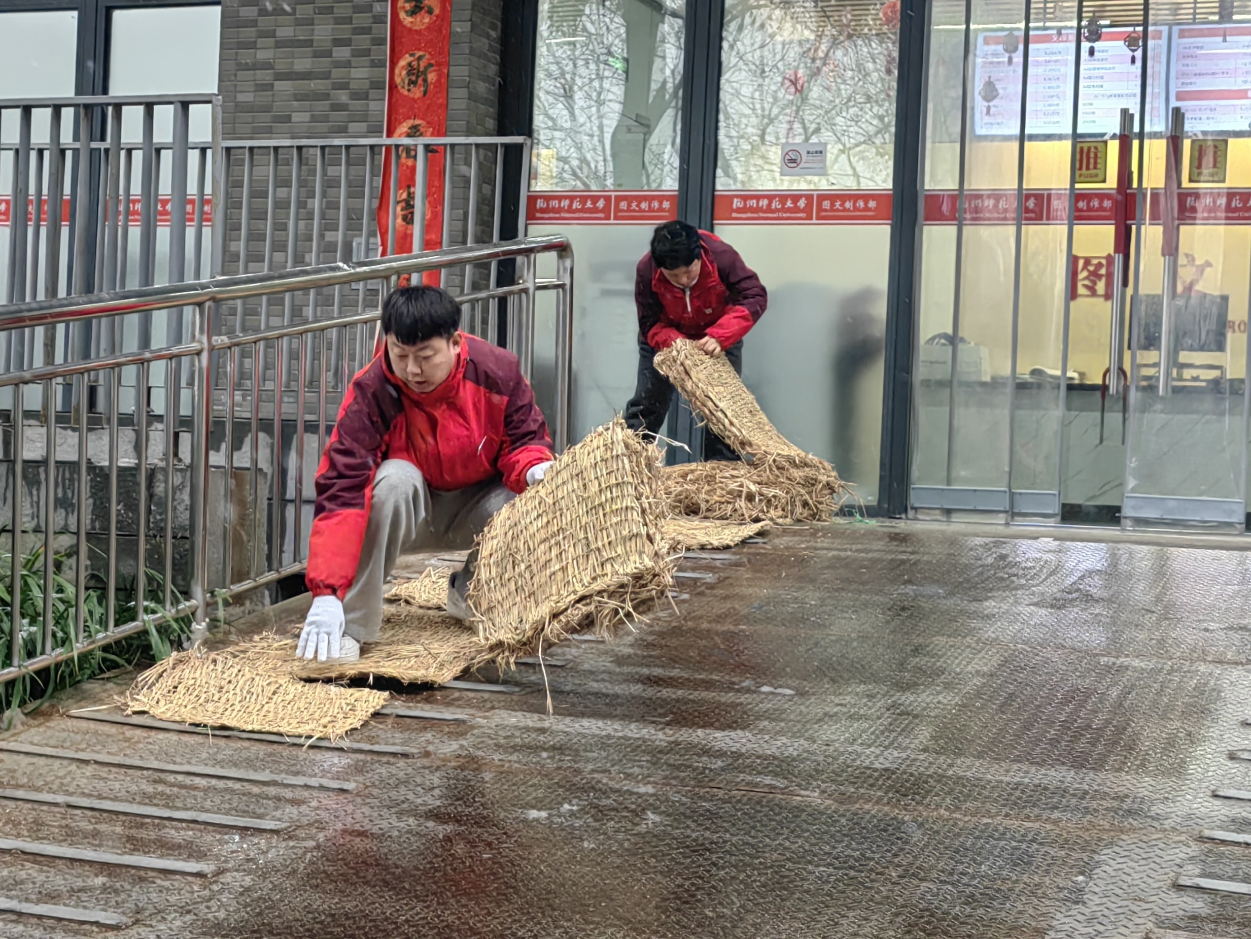 ▲综合服务中心图文制作部积极做好雨雪天气下安全守护工作。1月20日,受强冷空气影响,服务点门前路面结冰,图文制作部迅速组织员工清扫除冰、铺设防滑设施,切实保障师生出行安全。