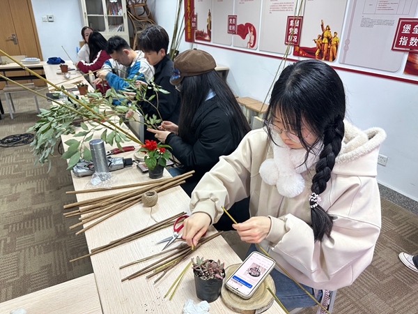 近日,仓前校区物业服务中心工匠工作室举办了植物景观DIY活动。活动前,工作人员精心准备了配饰植物、竹管、木棍、麻绳、热熔胶等制作材料。活动现场,指导老师向同学们讲解了植物景观制作的注意事项与实用技巧。同学们兴致盎然,认真动手制作属于自己的植物小景。作品完成后,大家相互交流心得体会,并拍照留念。