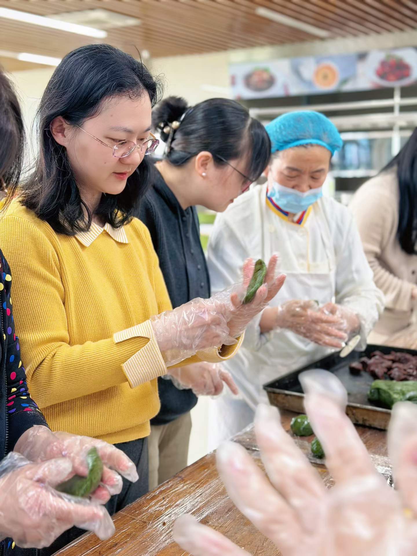 ▲饮食服务中心组织开展青团劳动课。4月1日,饮食服务中心在慎园18号楼学生劳动实训实践基地组织开展青团劳动课。面点师傅现场讲解揉团、包馅、压模等关键步骤,并示范馅料包裹的均匀性。学生们分组协作,从包入豆沙、咸菜笋丁馅料到使用模具压制成型,全程动手操作。在师傅指导下,同学们不断尝试调整,制作出色泽翠绿、形态各异的青团。活动提升了学生的劳动技能,也让大家在亲手制作中体会到“一箸一食皆文化”的深层意义。