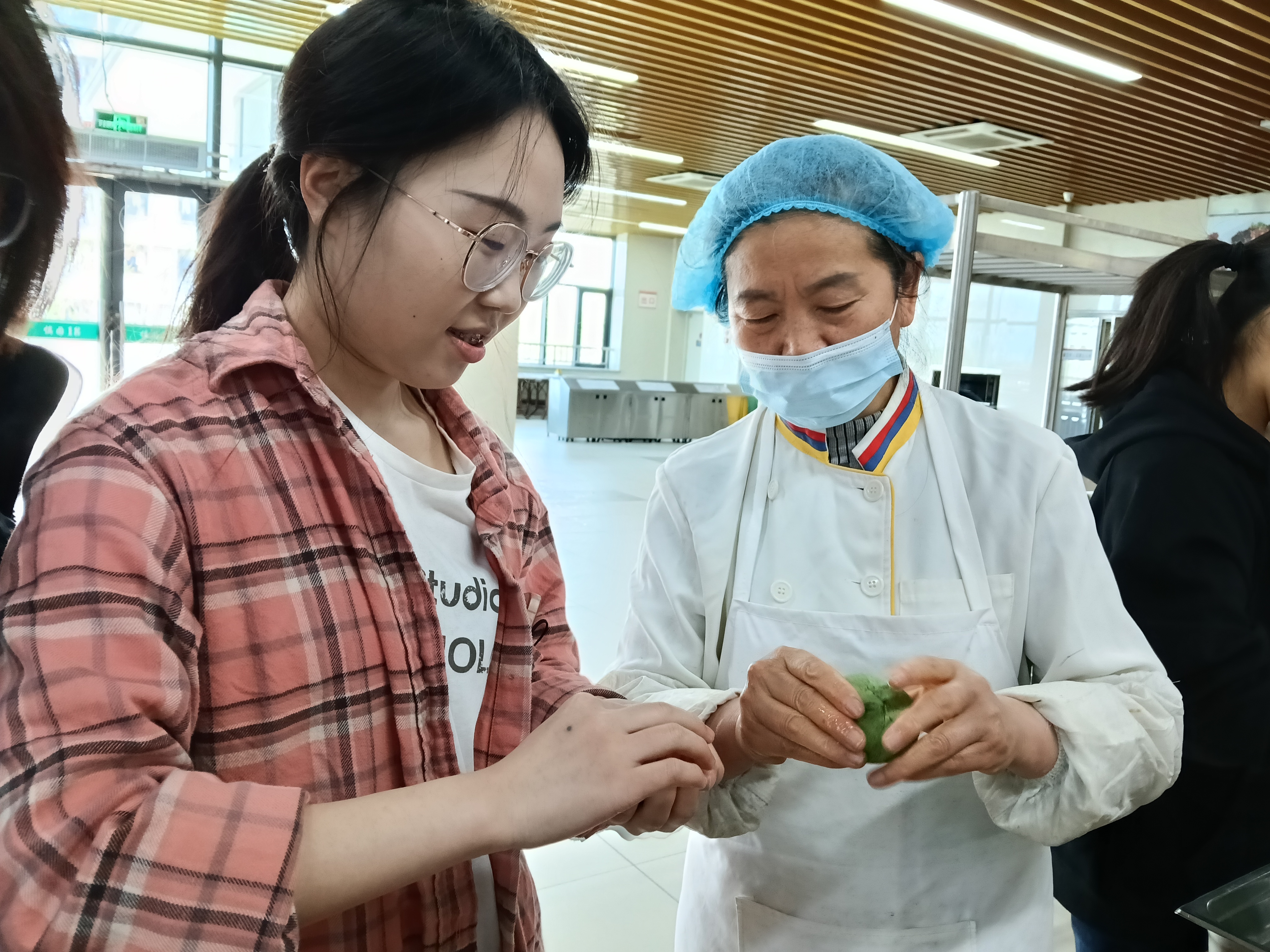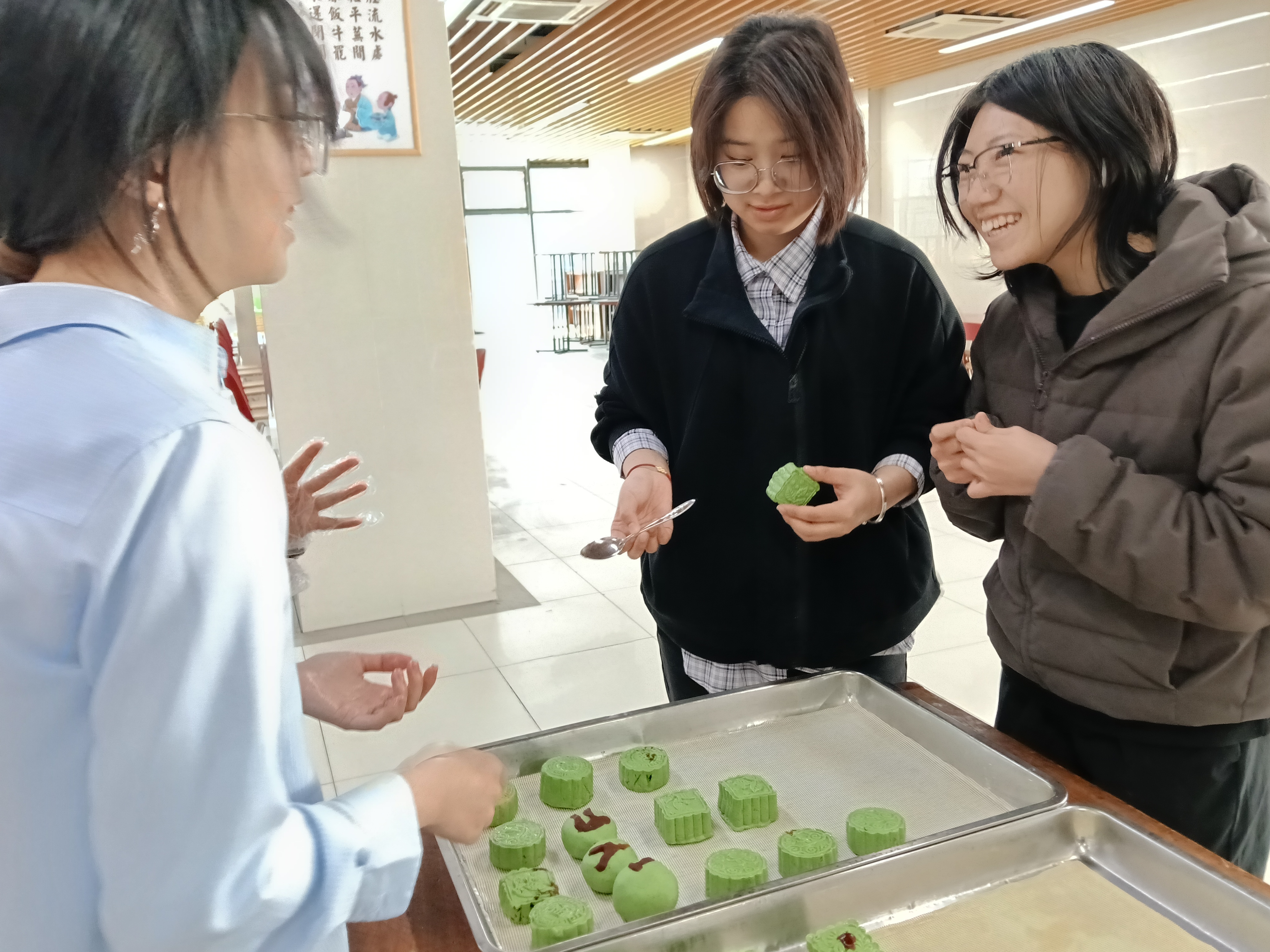 活动伊始,饮食服务中心的面点师傅从青团的传统民俗讲起,现场演示了揉团、包馅、压模等关键步骤,并特别提醒学生注意馅料包裹的均匀性,以免蒸制时漏馅。在随后的实操环节,师傅们为学生们分好面团,大家以小组为单位协作配合,亲手包入豆沙、咸菜笋丁等甜咸两种馅料,再使用模具压制成型。现场气氛热烈,同学们在师傅的指导下不断尝试、调整,有的青团圆润饱满,有的造型别致独特。不一会儿,一盘盘色泽翠绿、形态各异的青团整齐排列在蒸垫上,蒸制完成后清香四溢,令人垂涎欲滴。