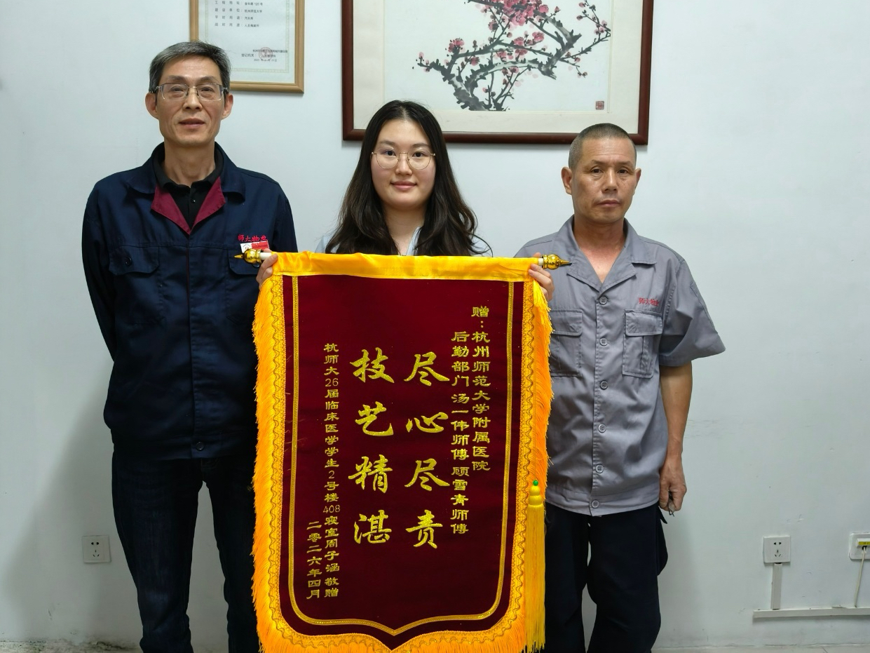 近日,城区服务中心金华路校区接连收到来自医学院周同学的双重暖心致谢——先是于“师生直通车”平台发来情真意切的感谢信,随后又专程将一面印有“尽心尽责 技艺精湛”的锦旗送到后勤工作人员汤一伟、顾雪青两位师傅手中。字里行间的感激与锦旗上的褒奖,为春日的校园增添了一抹温暖底色。